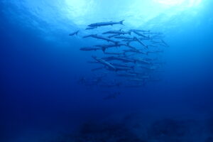水中にはビシッと隊列を組んだバラクーダの群れが登場!