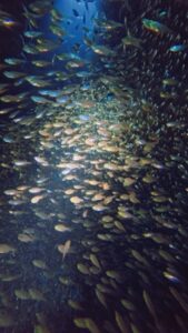 • バラクーダの群れがキラキラと流れるように泳ぎ